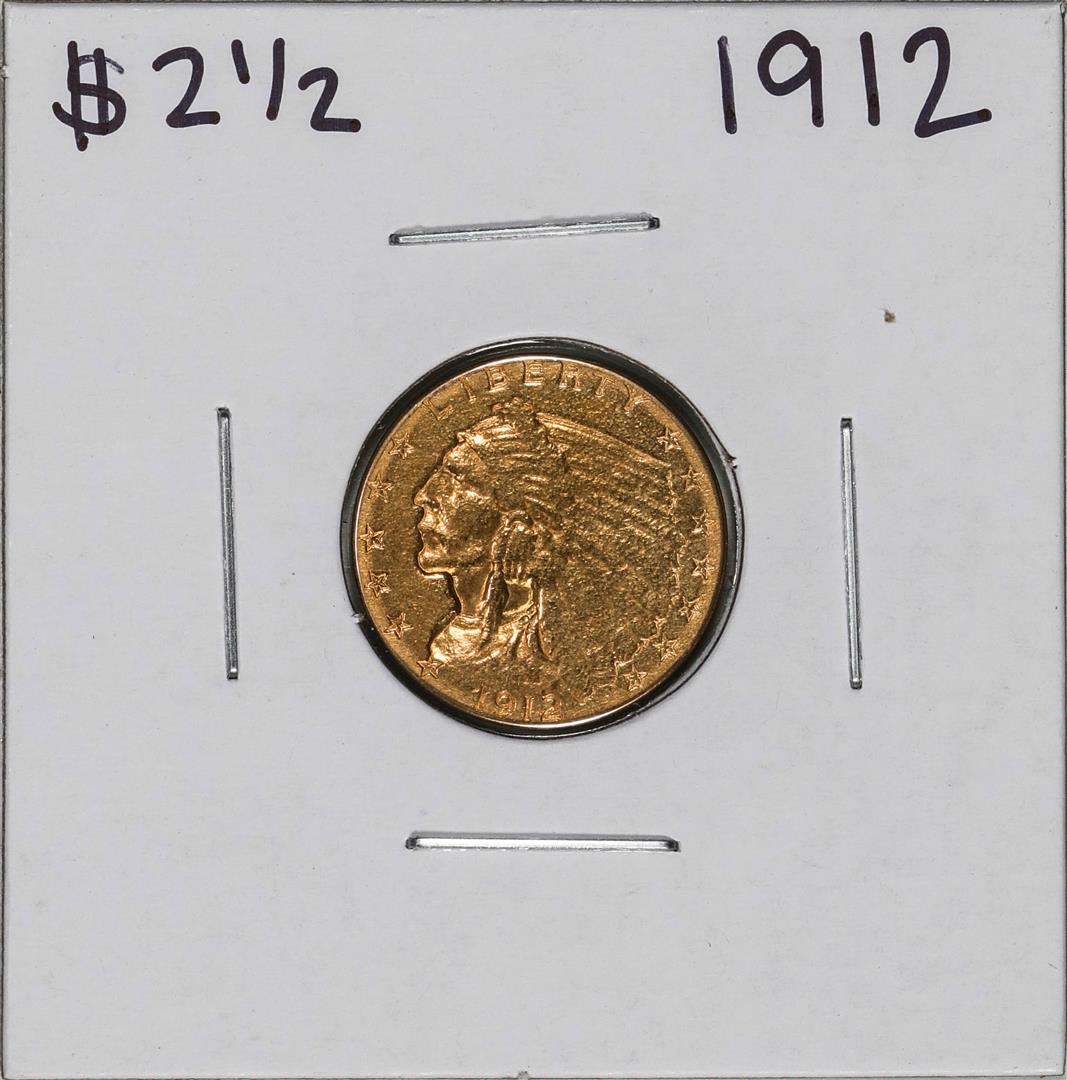 One 1912 $2 1/2 Indian Head Quarter Eagle Gold Coin, please note there is some damage to the coin as shown in the pictures.