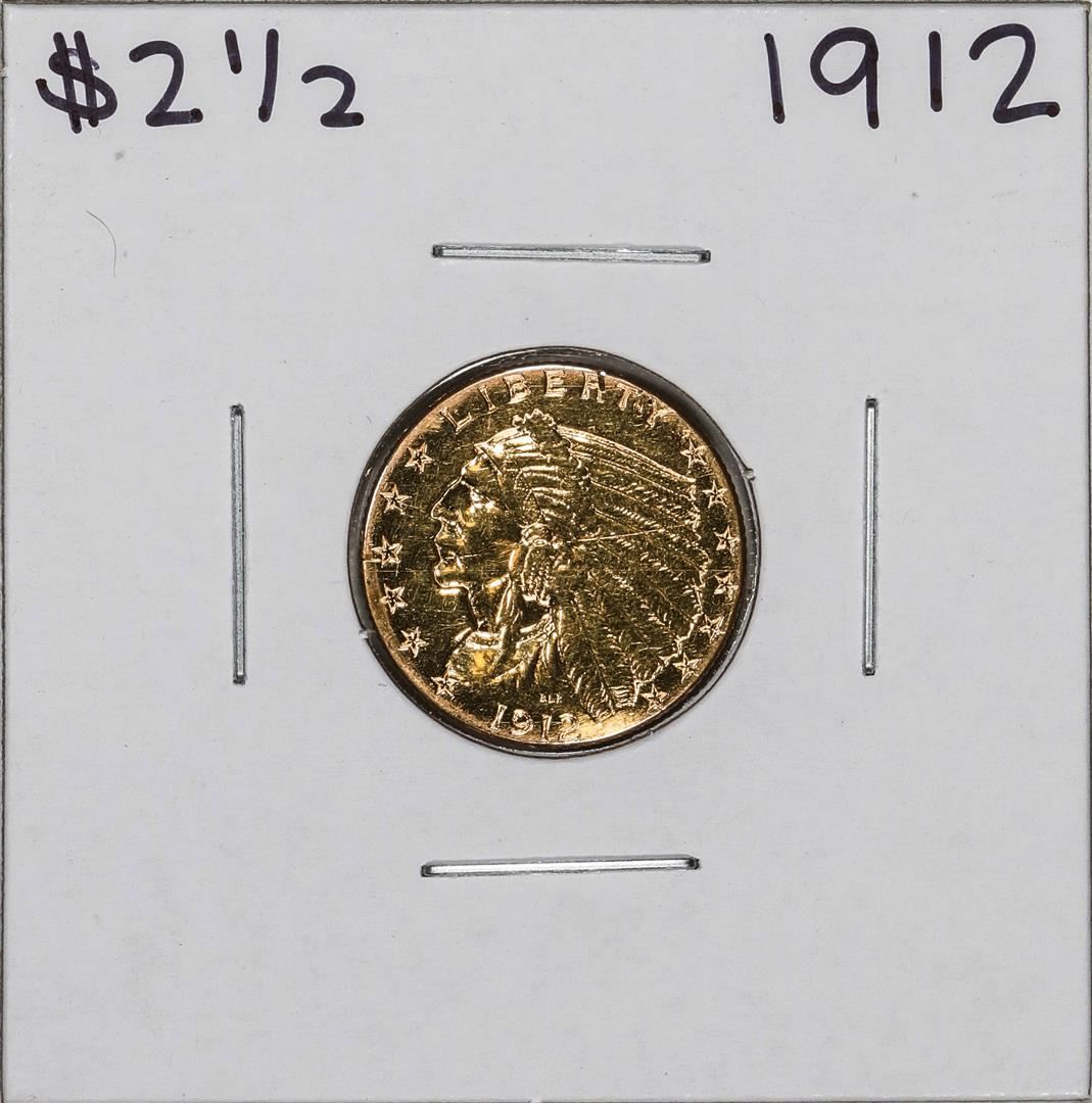 One 1912 $2 1/2 Indian Head Quarter Eagle Gold Coin, please note there is some damage to the coin as shown in the pictures.