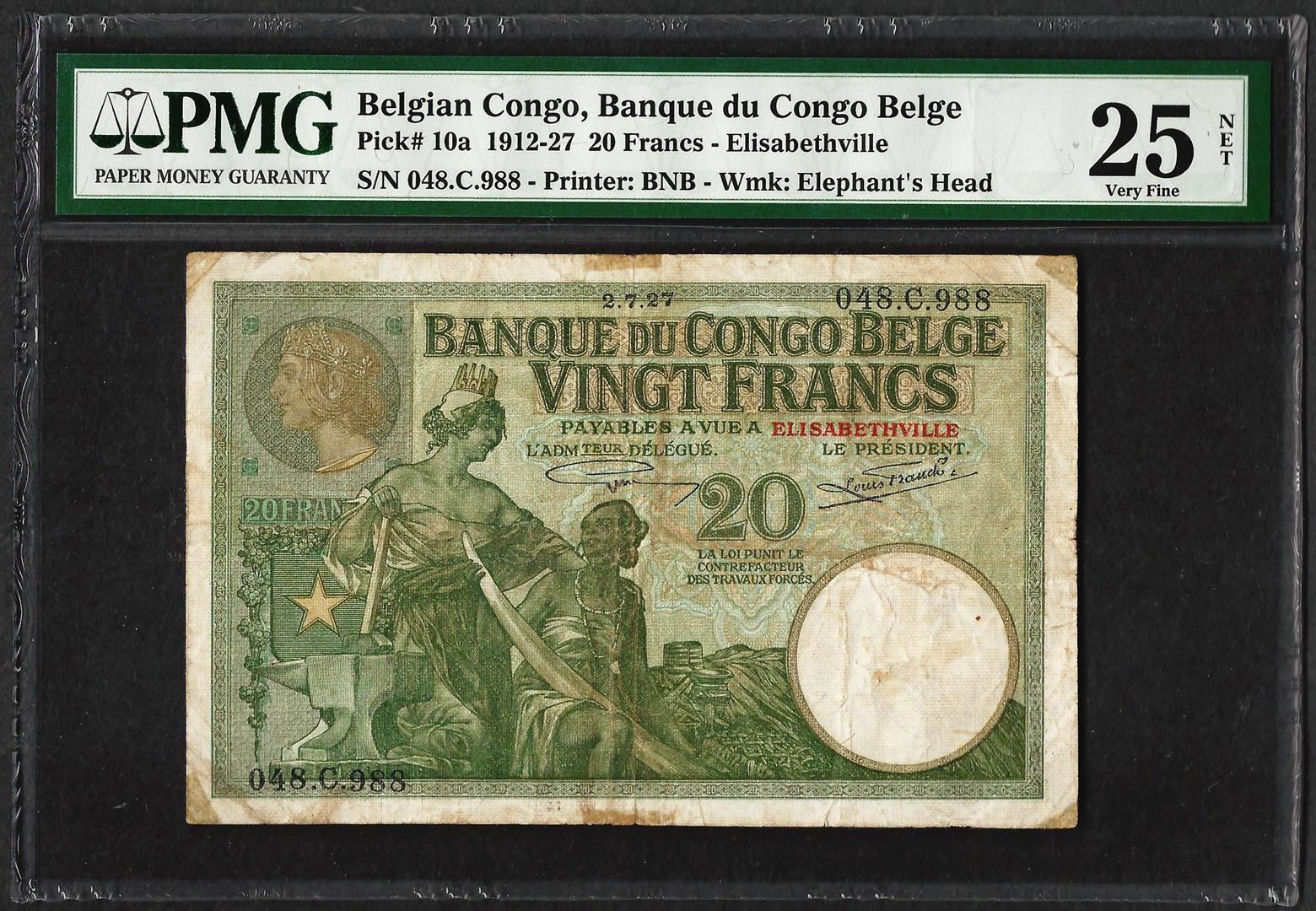 One 1912-27 Belgian Congo Banque du Congo Belge 20 Francs Bank Note PMG Very Fine 25 Net. PMG Certified.