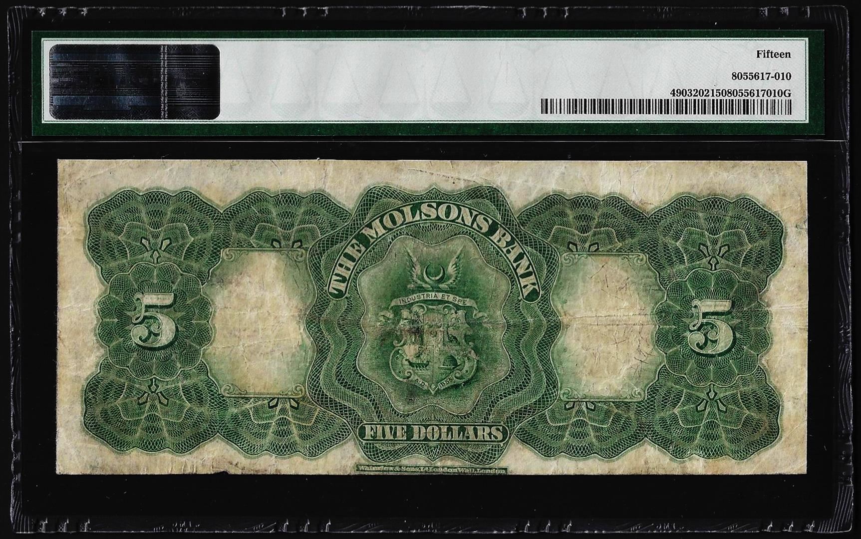 One 1912 $5 Canada Montreal The Molsons Bank Note PMG Choice Fine 15. PMG Certified.