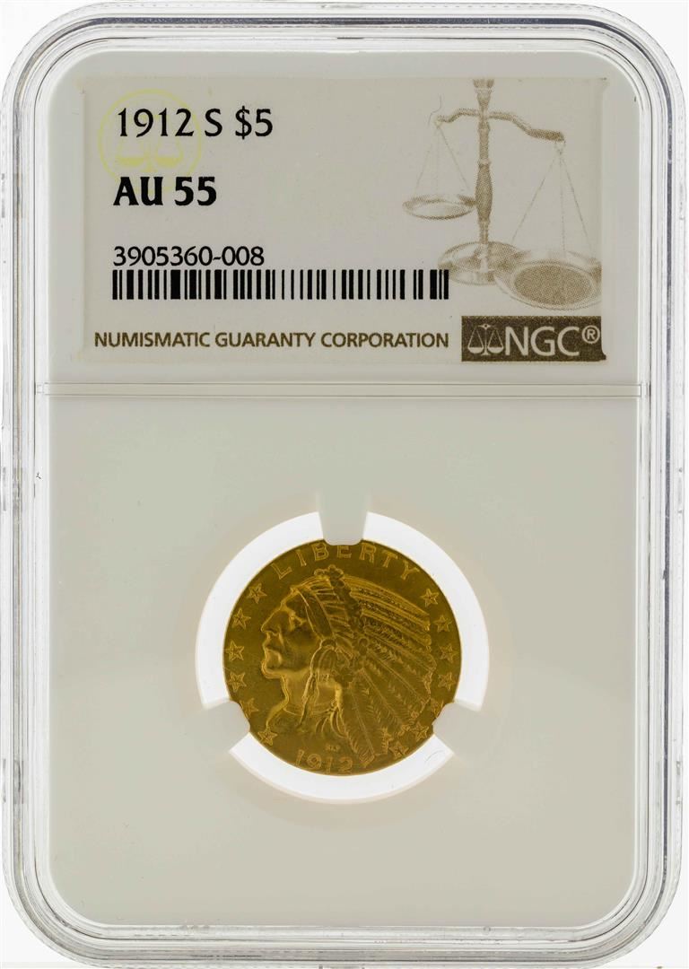 One 1912 $5 Indian Head Half Eagle Gold Coin NGC AU55. NGC Certified.