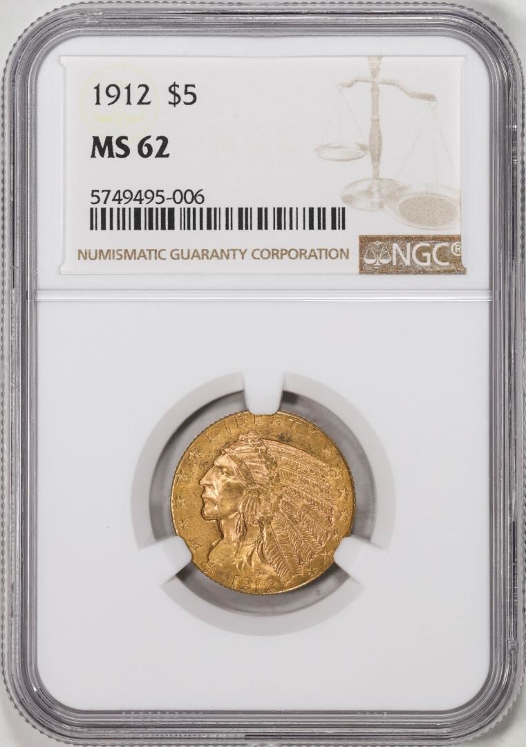 1912 $5 Indian Head Half Eagle Gold Coin NGC MS62