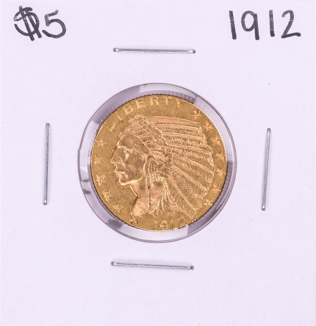 One 1912 $5 Indian Head Half Eagle Gold Coin.