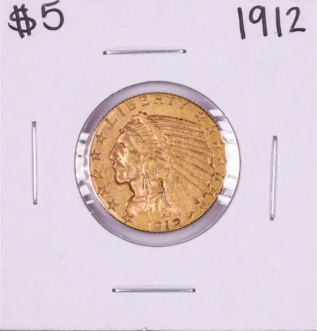One 1912 $5 Indian Head Half Eagle Gold Coin.