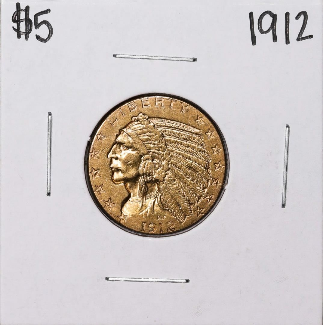 One 1912 $5 Indian Head Half Eagle Gold Coin.