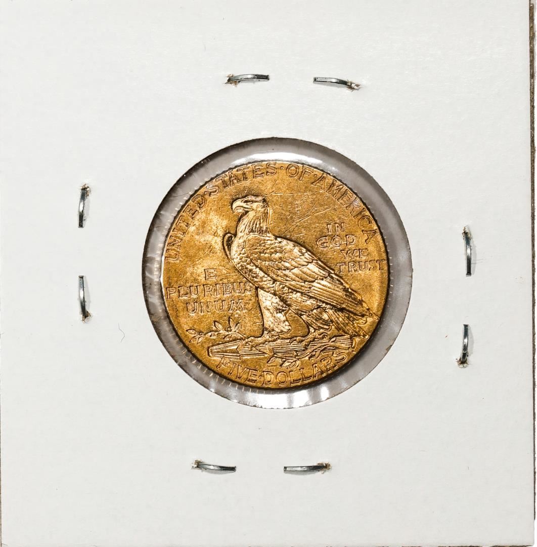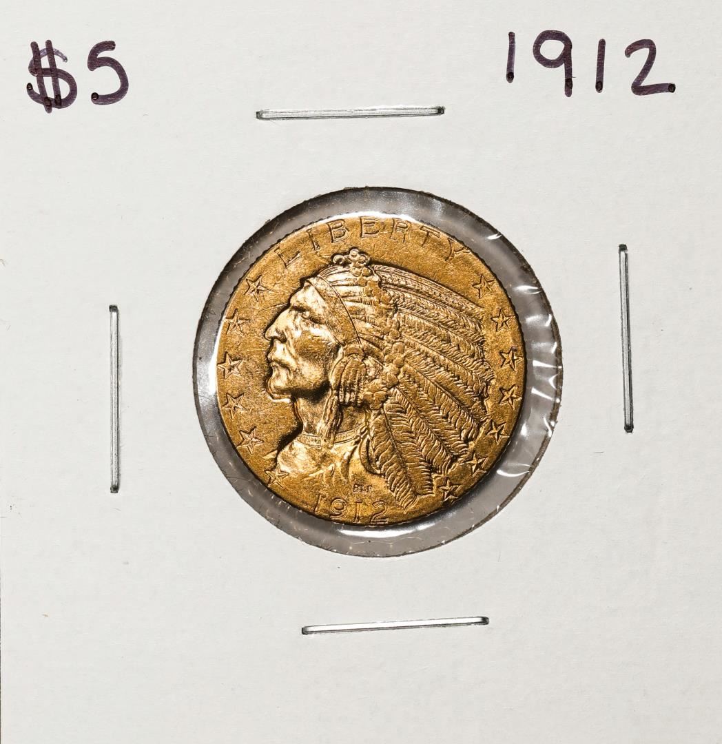 One 1912 $5 Indian Head Half Eagle Gold Coin.