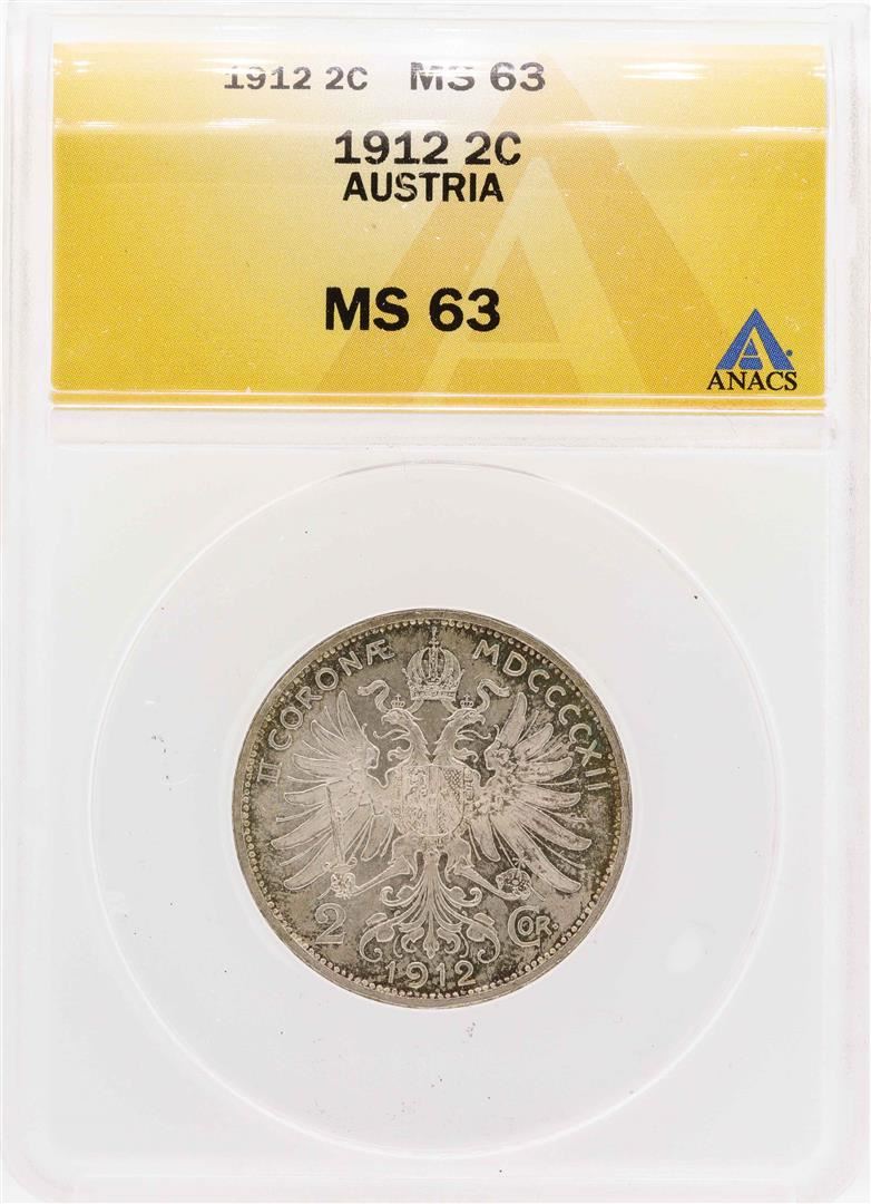One 1912 Austria 2 Corona Coin ANACS MS63. ANACS Certified.