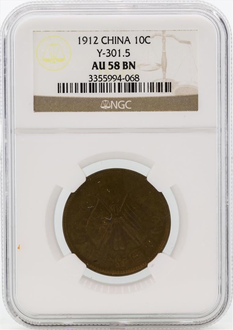 One 1912 China 10 Cents Coin NGC AU58 BN. NGC Certified.
