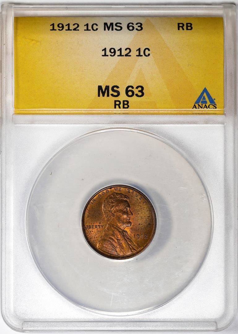 One 1912 Lincoln Wheat Cent Coin ANACS MS63RB. ANACS Certified.