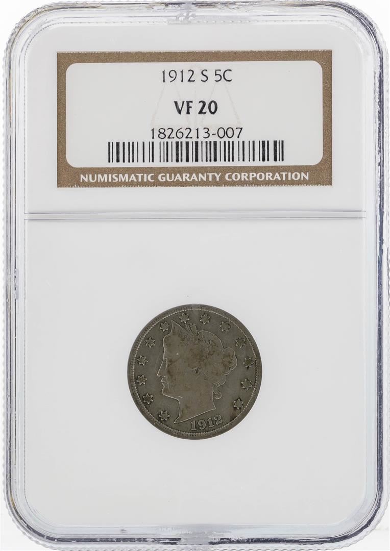 One 1912-S 5 Cent Liberty Head Coin NGC VF20. NGC Certified.