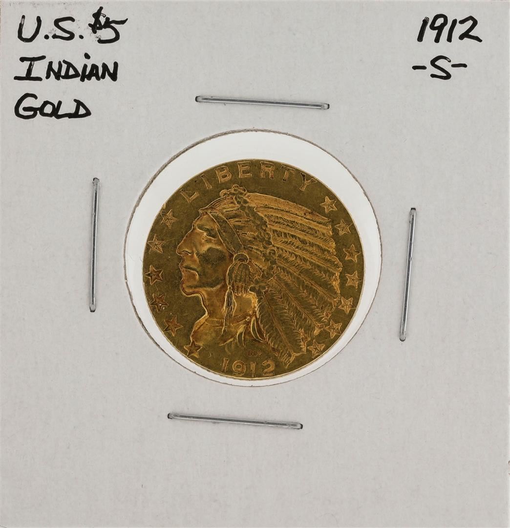 One 1912-S $5 Indian Head Half Eagle Gold Coin.