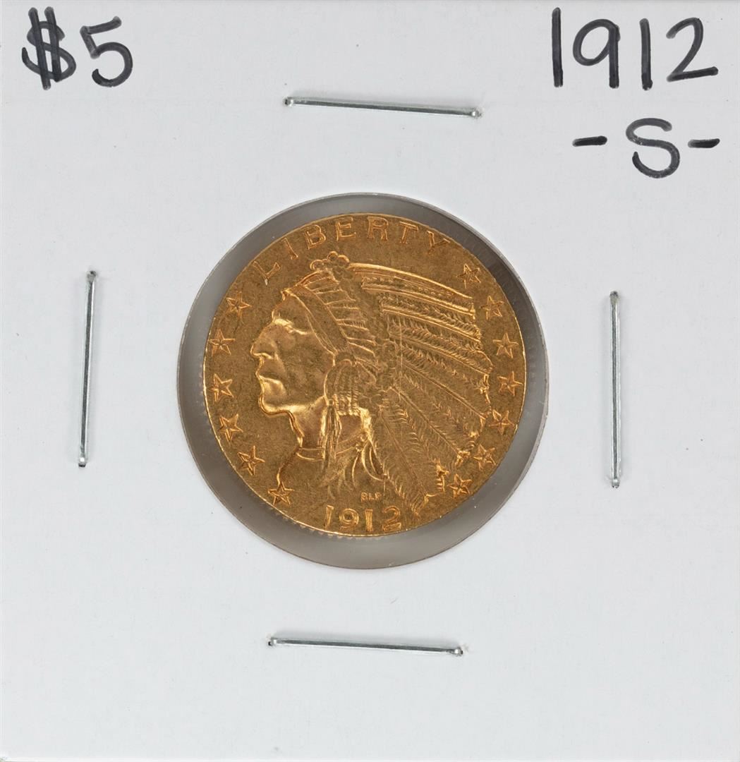 One 1912-S $5 Indian Head Half Eagle Gold Coin.