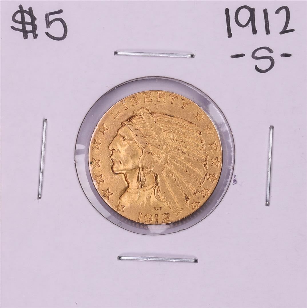 One 1912-S $5 Indian Head Half Eagle Gold Coin.