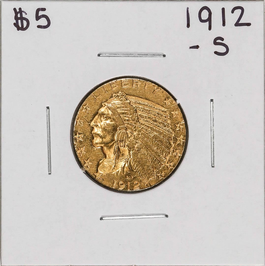 One 1912-S $5 Indian Head Half Eagle Gold Coin.