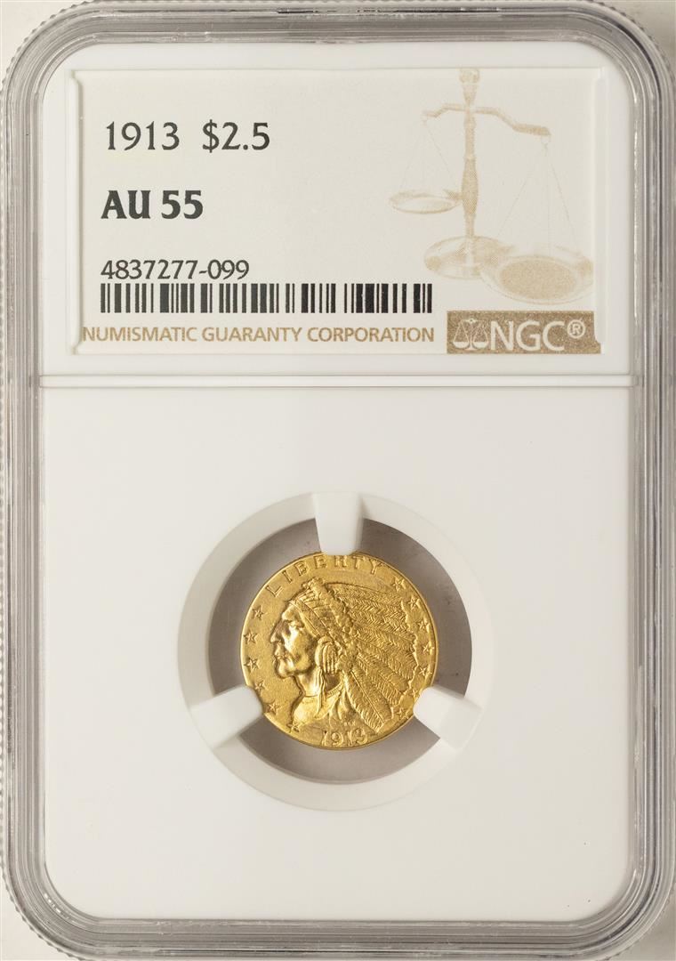 One 1913 $2 1/2 Indian Head Quarter Eagle Gold Coin AU55.