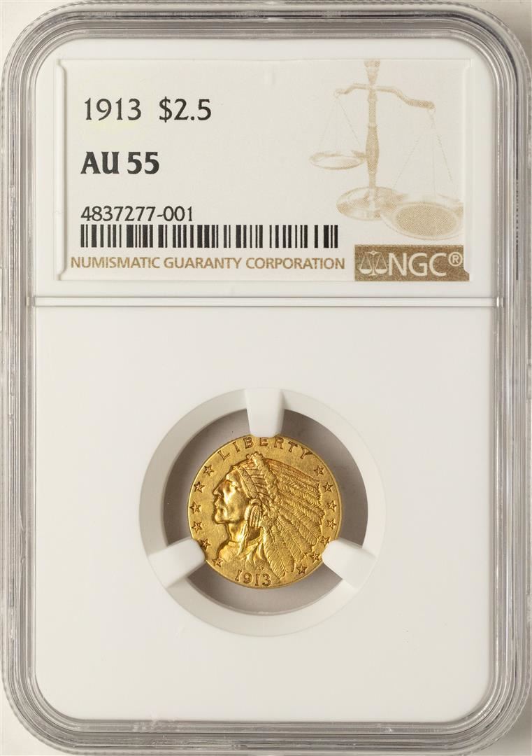 One 1913 $2 1/2 Indian Head Quarter Eagle Gold Coin AU55.