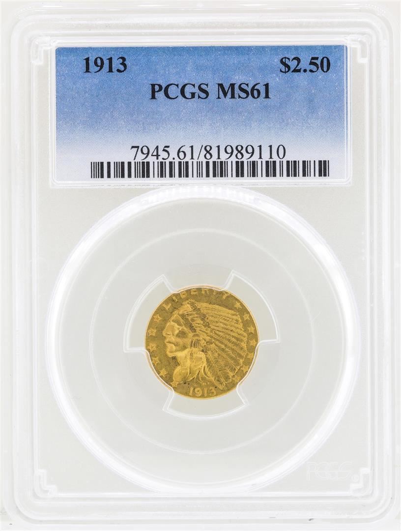 One 1913 $2 1/2 Indian Head Quarter Eagle Gold Coin NGC MS61. NGC Certified.