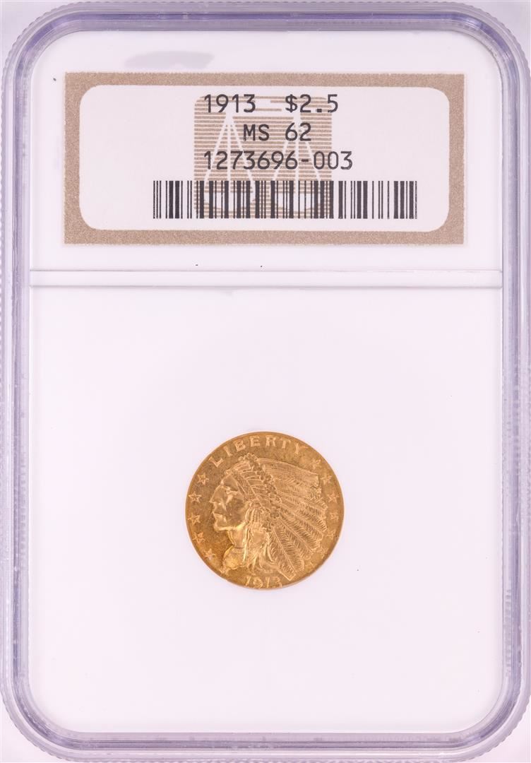 One 1913 $2 1/2 Indian Head Quarter Eagle Gold Coin NGC MS62. NGC Certified.