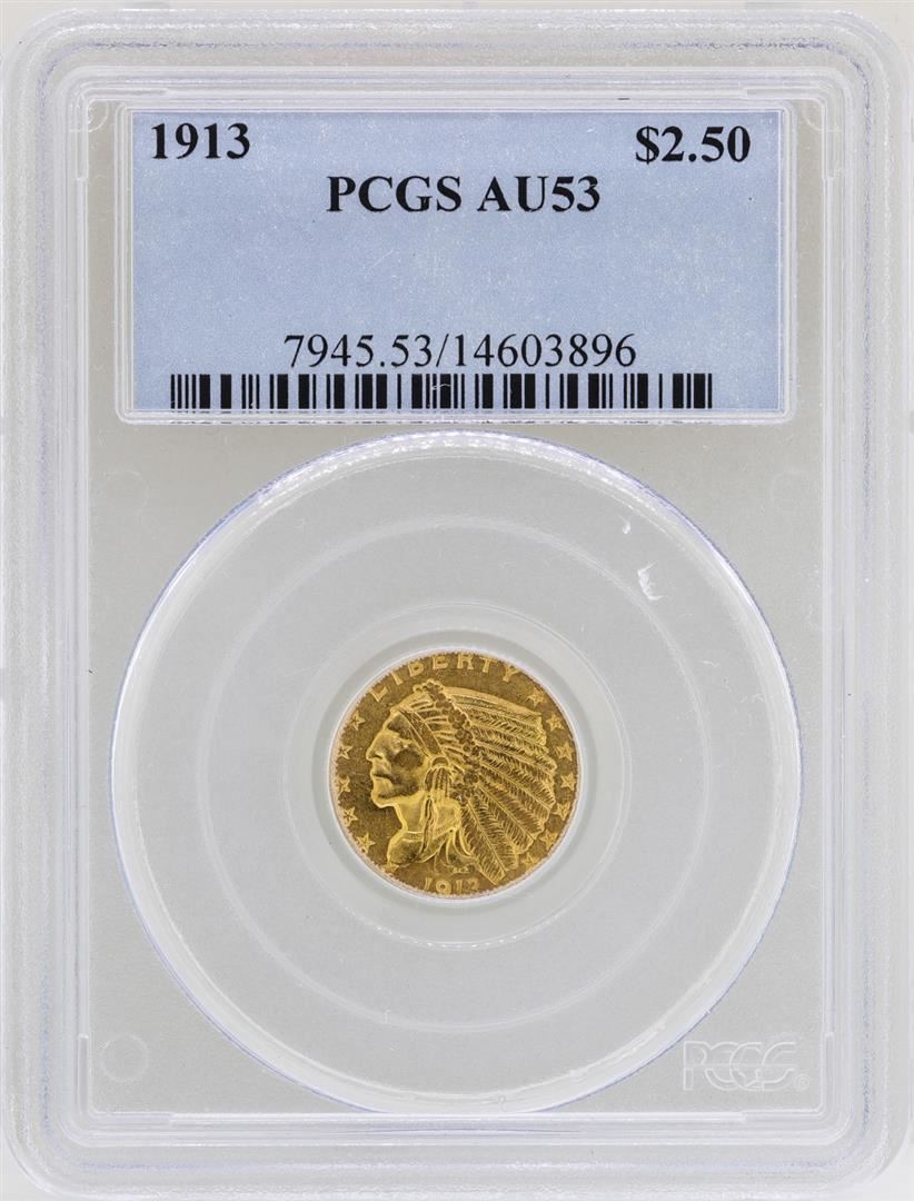 One 1913 $2 1/2 Indian Head Quarter Eagle Gold Coin PCGS AU53. PCGS Graded.