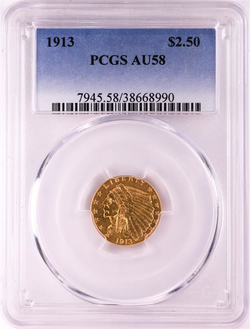 One 1913 $2 1/2 Indian Head Quarter Eagle Gold Coin PCGS AU58. PCGS Graded.