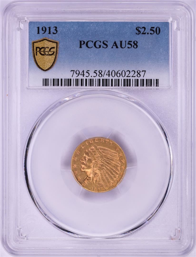 One 1913 $2 1/2 Indian Head Quarter Eagle Gold Coin PCGS AU58. PCGS Graded.