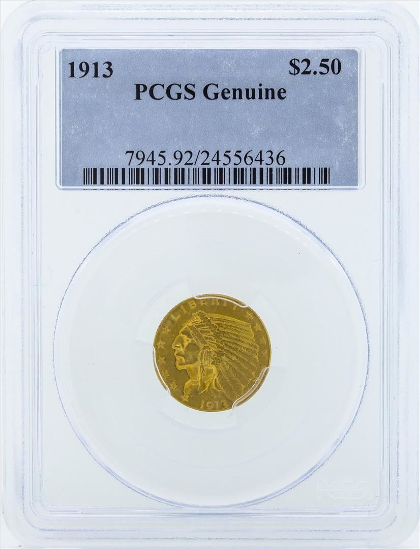 One 1913 $2 1/2 Indian Head Quarter Eagle Gold Coin PCGS Genuine. PCGS Graded.
