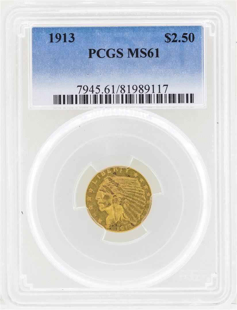 One 1913 $2 1/2 Indian Head Quarter Eagle Gold Coin PCGS MS61. PCGS Graded.