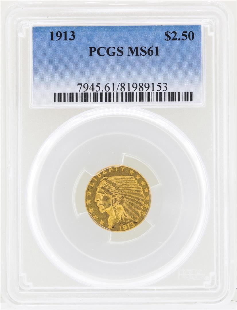 One 1913 $2 1/2 Indian Head Quarter Eagle Gold Coin PCGS MS61. PCGS Graded.