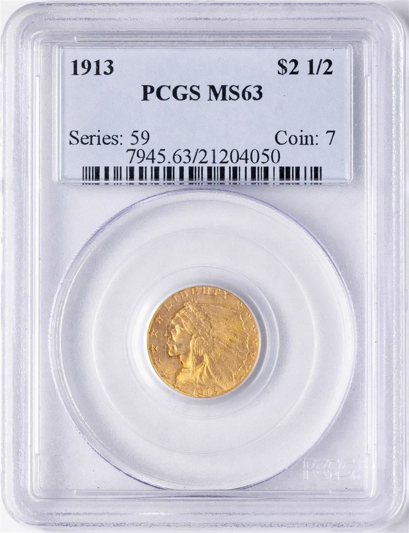 One 1913 $2 1/2 Indian Head Quarter Eagle Gold Coin PCGS MS63. PCGS Graded.