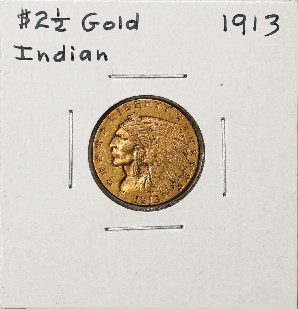 One 1913 $2 1/2 Indian Head Quarter Eagle Gold Coin.