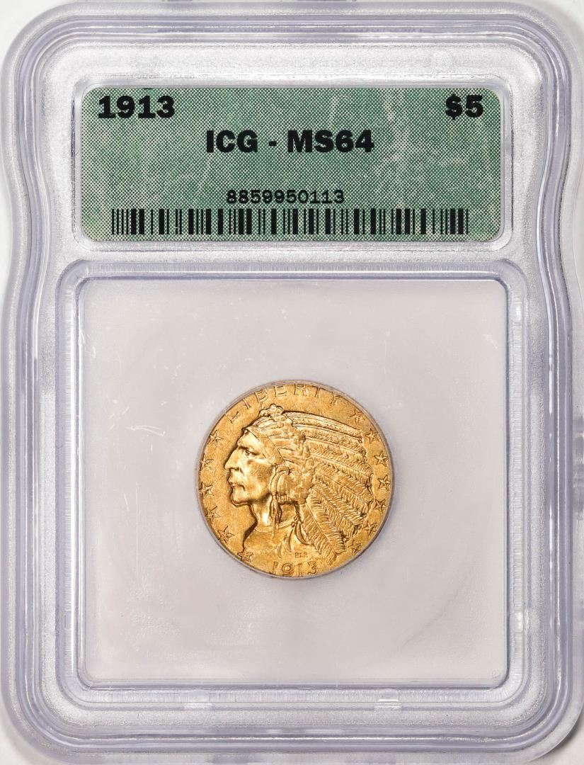 One 1913 $5 Indian Head Half Eagle Gold Coin ICG MS64. ICG Certified.