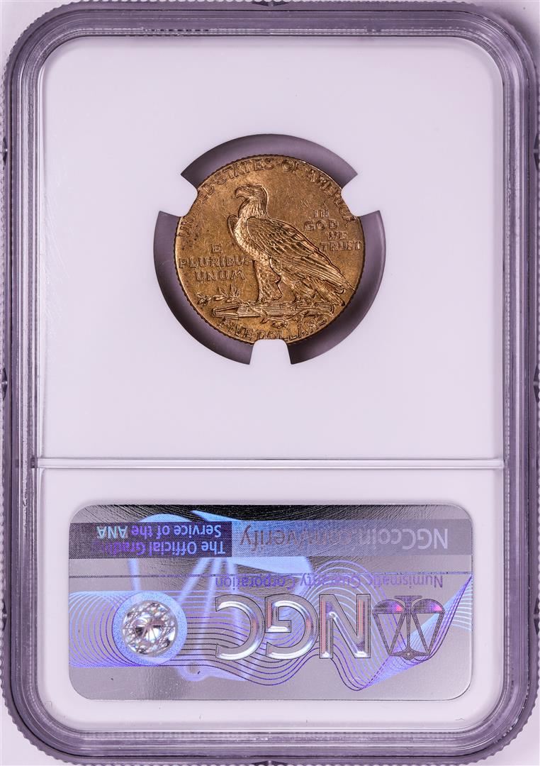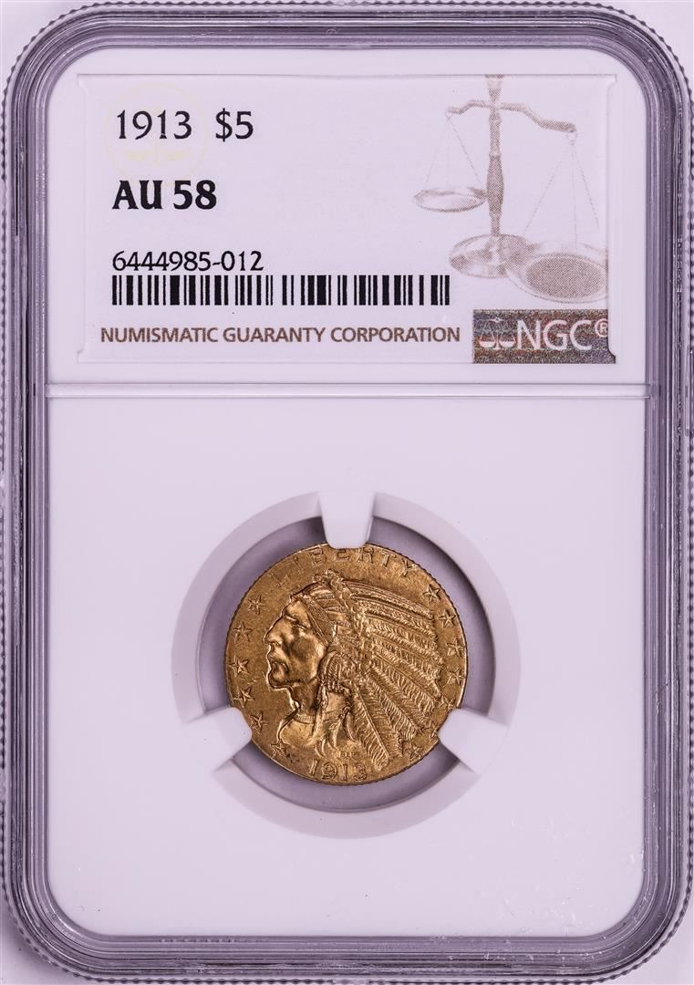 One 1913 $5 Indian Head Half Eagle Gold Coin NGC AU58. NGC Certified.