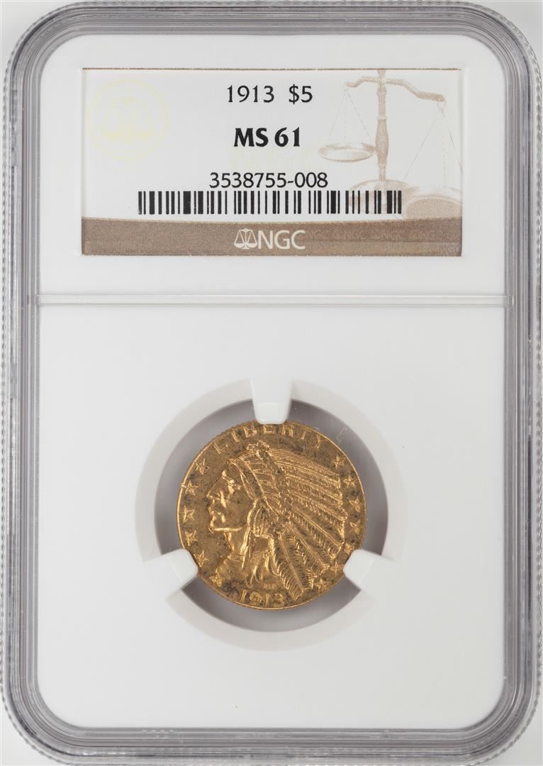 One 1913 $5 Indian Head Half Eagle Gold Coin NGC MS61. NGC Certified.