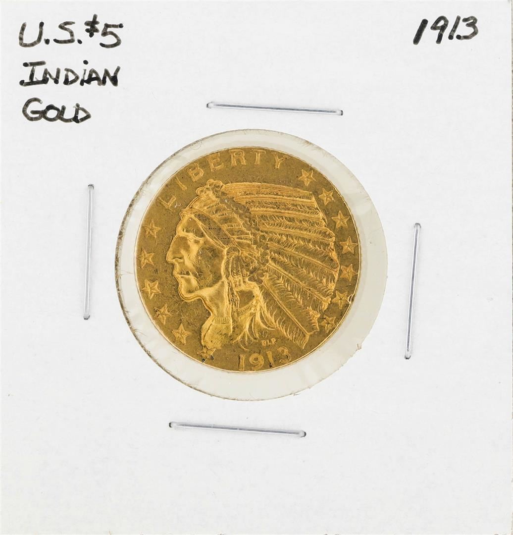 One 1913 $5 Indian Head Half Eagle Gold Coin.
