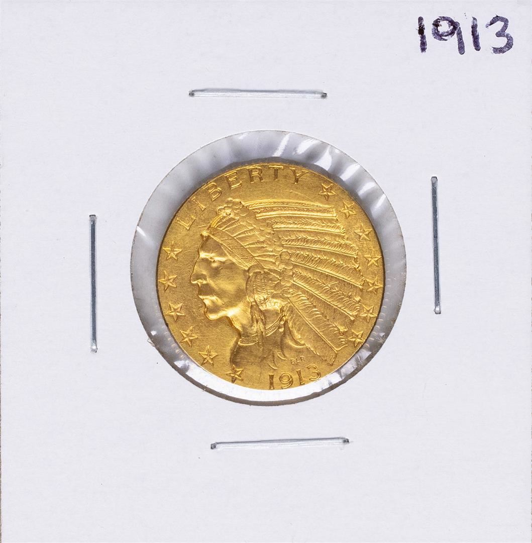 One 1913 $5 Indian Head Half Eagle Gold Coin.