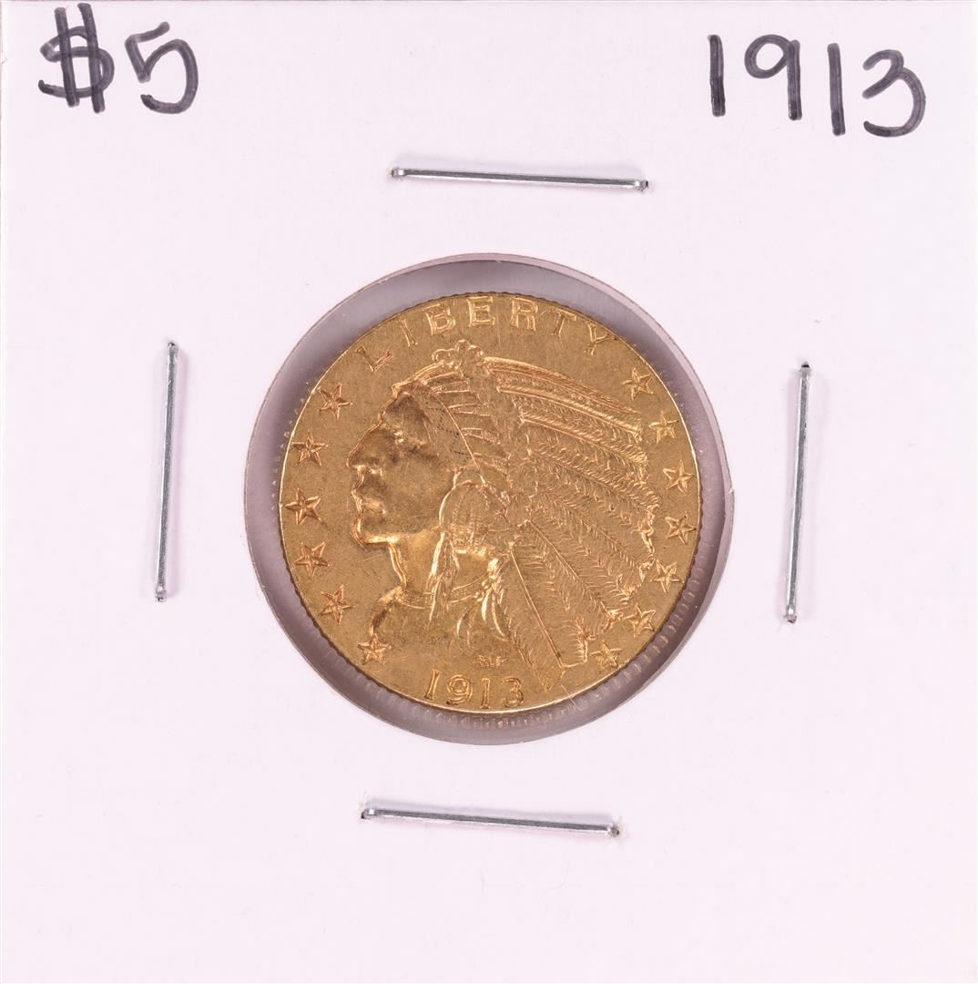 One 1913 $5 Indian Head Half Eagle Gold Coin.