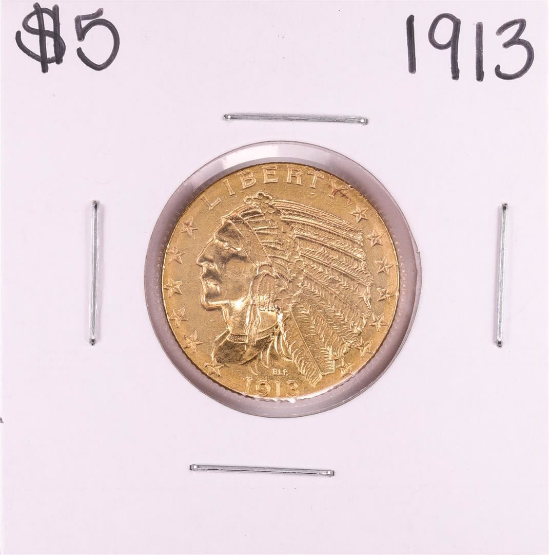 One 1913 $5 Indian Head Half Eagle Gold Coin.