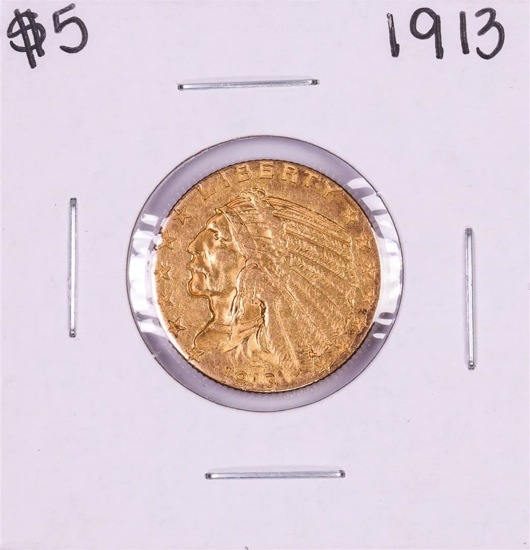 One 1913 $5 Indian Head Half Eagle Gold Coin.