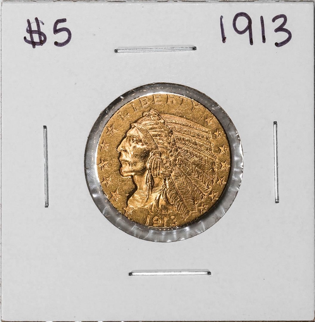One 1913 $5 Indian Head Half Eagle Gold Coin.