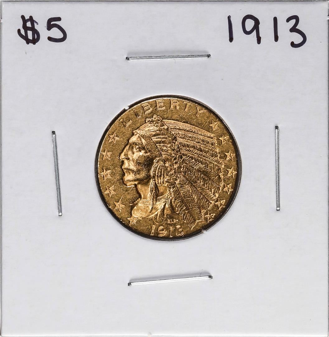 One 1913 $5 Indian Head Half Eagle Gold Coin.