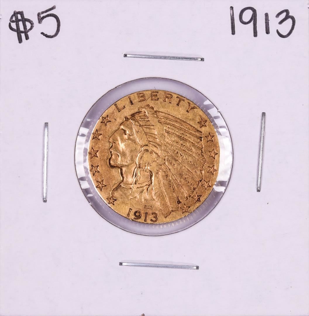 One 1913 $5 Indian Head Half Eagle Gold Coin.