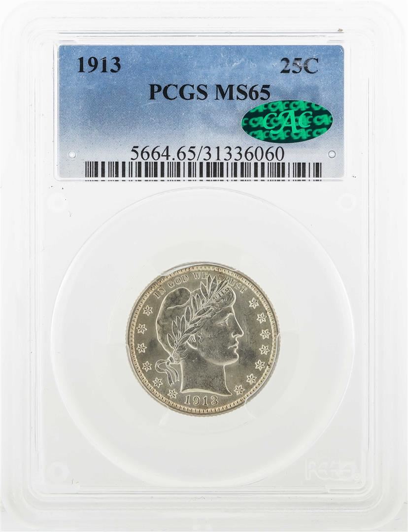 One 1913 Barber Quarter Dollar Coin PCGS MS65 CAC. PCGS Graded.