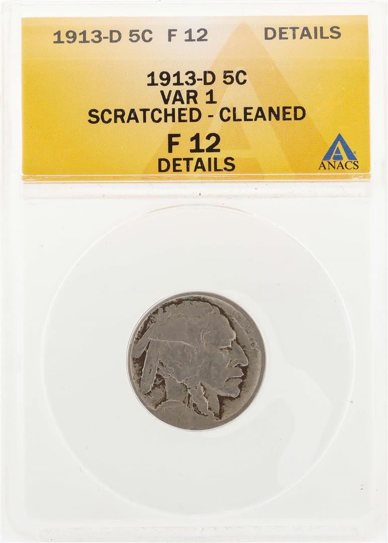 One 1913-D Buffalo Nickel Coin Variety 1 ANACS F12 Details Scratched Cleaned. ANACS Certified.
