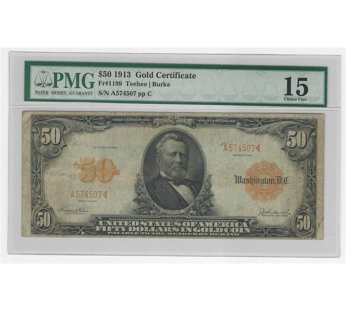 One 1913 Large $50 Gold Certificate Note PMG Choice Fine 15. PMG Certified.