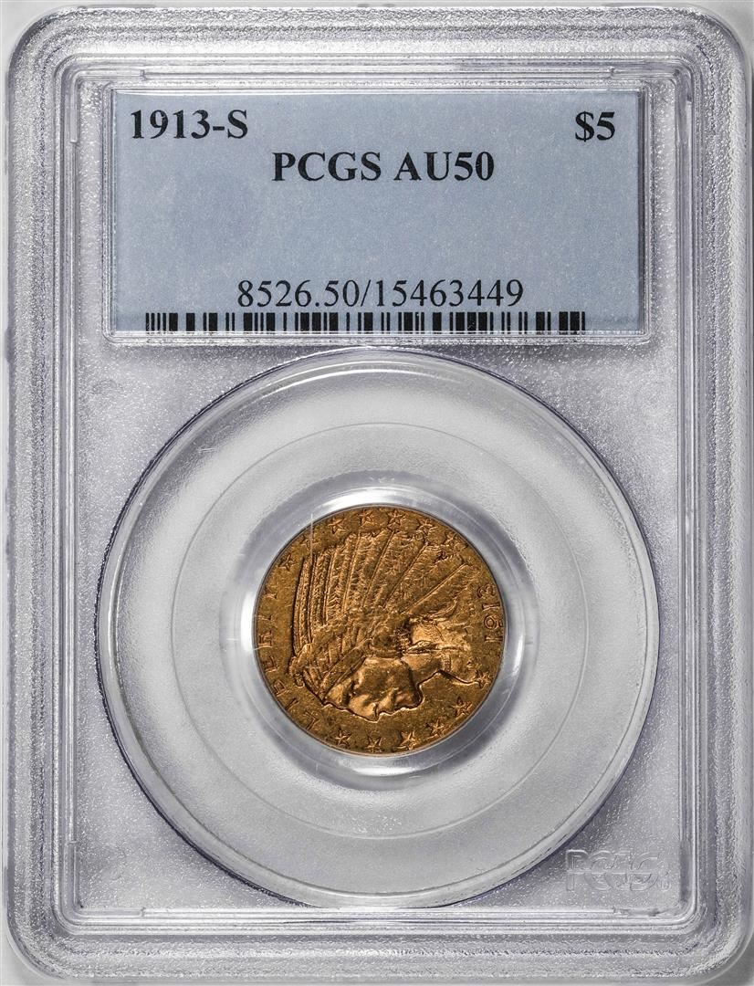 One 1913-S $5 Indian Head Half Eagle Coin PCGS AU50. PCGS Graded.