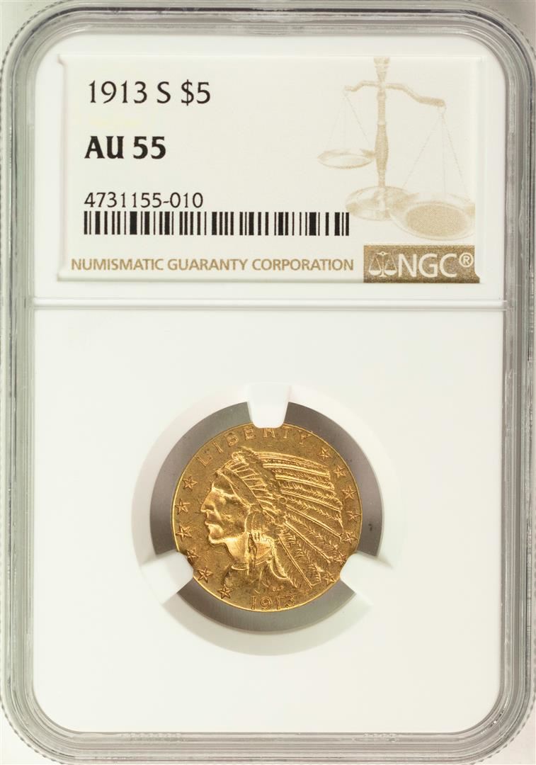 One 1913-S $5 Indian Head Half Eagle Gold Coin NGC AU55. NGC Certified.