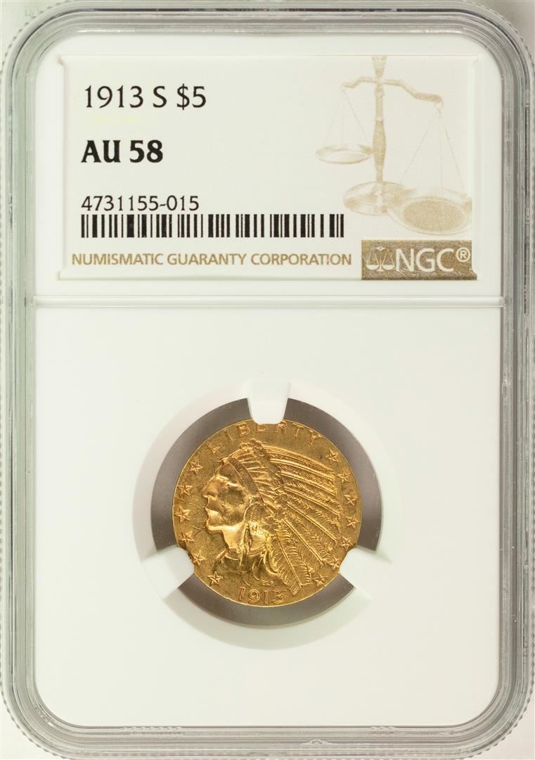 One 1913-S $5 Indian Head Half Eagle Gold Coin NGC AU58. NGC Certified.