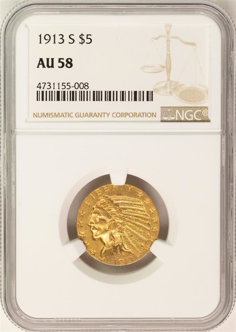 One 1913-S $5 Indian Head Half Eagle Gold Coin NGC AU58. NGC Certified.