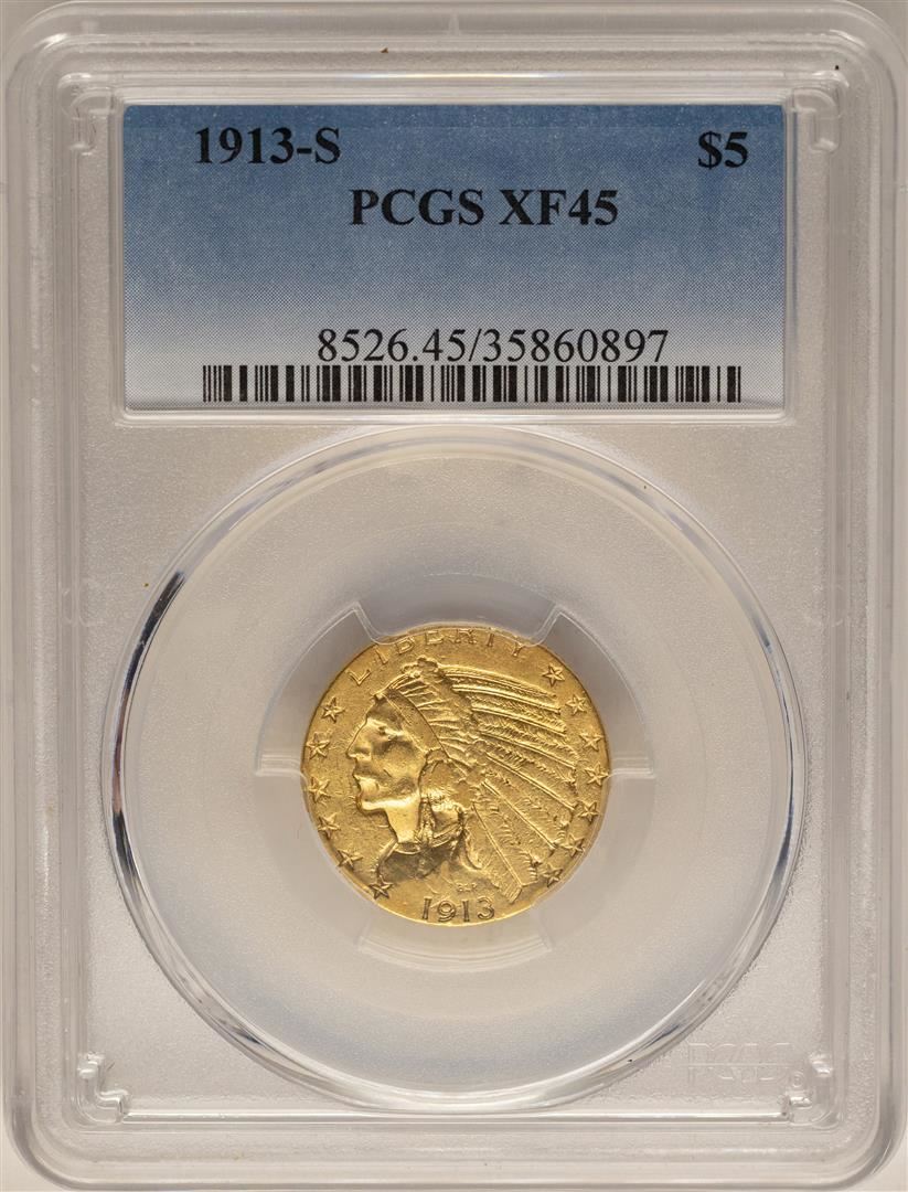 One 1913-S $5 Indian Head Half Eagle Gold Coin PCGS XF45. PCGS Graded.