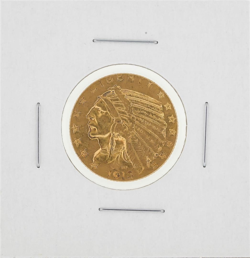 One 1913-S $5 Indian Head Half Eagle Gold Coin.